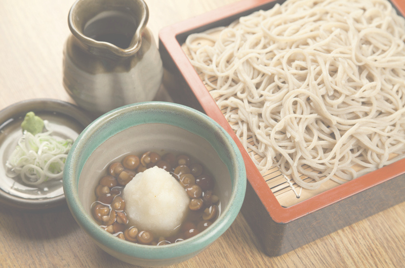 Hand-made soba made from Yamizo soba, a buckwheat flour produced by contracted farmers in Nakagawa-machi, Tochigi Pref. Served chilled with cold tsuyu, a soy-based dipping sauce.