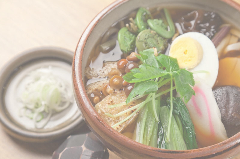 Soba served with sansai, edible wild plants, nameko mushrooms, bamboo shoot, shiitake mushroom and a boiled egg. The subtle smoky aroma of grilled abura-age (fried tofu) and fragrant mitsuba herb compliment this country-style dish.