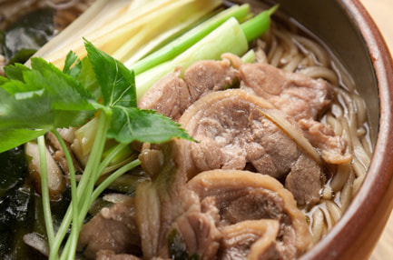 Cold soba with hot dipping soup. Tender slices of duck, home-raised in Japan, cooked in soup with burdock and grilled leek for extra aroma.