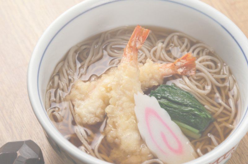 Toppings include: prawn tempura, kamaboko fish cake, slices of Japanese omelet, bamboo shoots, shiitake mushroom, a boiled egg and some fu (baked wheat gluten). Adding a square of Mochi (rice cake) is also highly recommended.