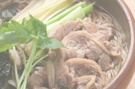 Cold soba with hot dipping soup. Tender slices of duck, home-raised in Japan, cooked in soup with burdock and grilled leek for extra aroma.