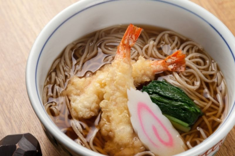 Toppings include: prawn tempura, kamaboko fish cake, slices of Japanese omelet, bamboo shoots, shiitake mushroom, a boiled egg and some fu (baked wheat gluten). Adding a square of Mochi (rice cake) is also highly recommended.
